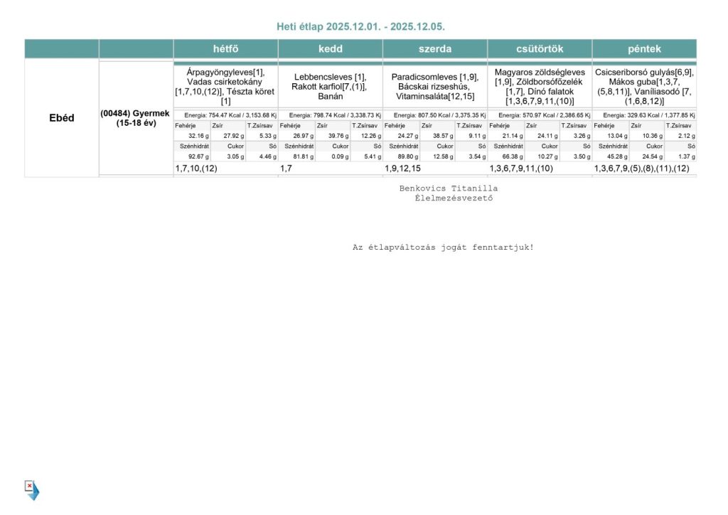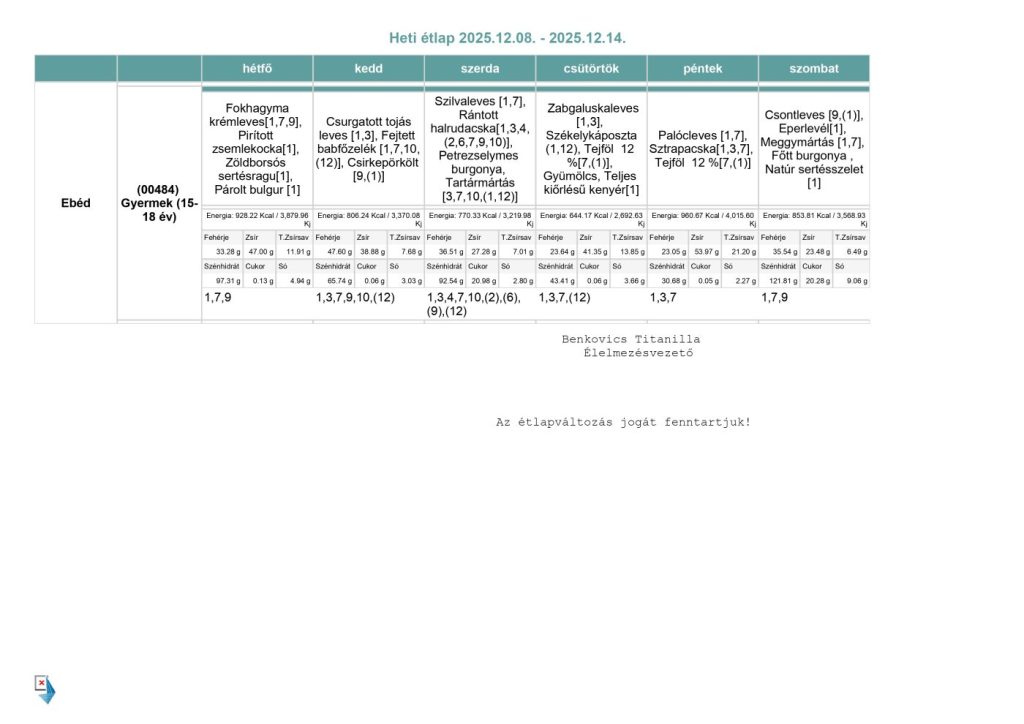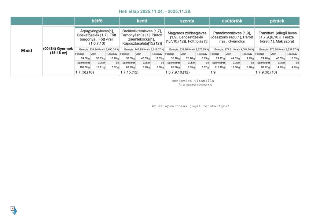 Étkezés lemondása: a következő napi étkezést a fenti telefonszámon/ email-címen 9.00 óráig